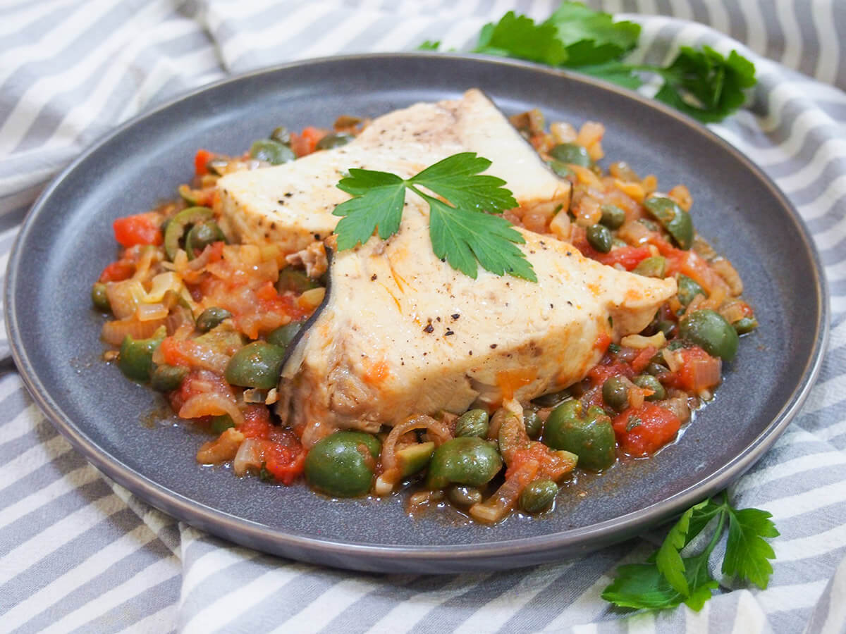 - الشوي (Grilling): هذه هي الطريقة الأكثر شعبية. يتم تقطيع السمكة إلى شرائح سميكة (Steaks) وتتبيلها بزيت الزيتون، الليمون، الملح، والفلفل. الشواء السريع يمنحها قشرة خارجية مقرمشة ويبقى اللحم من الداخل طرياً.