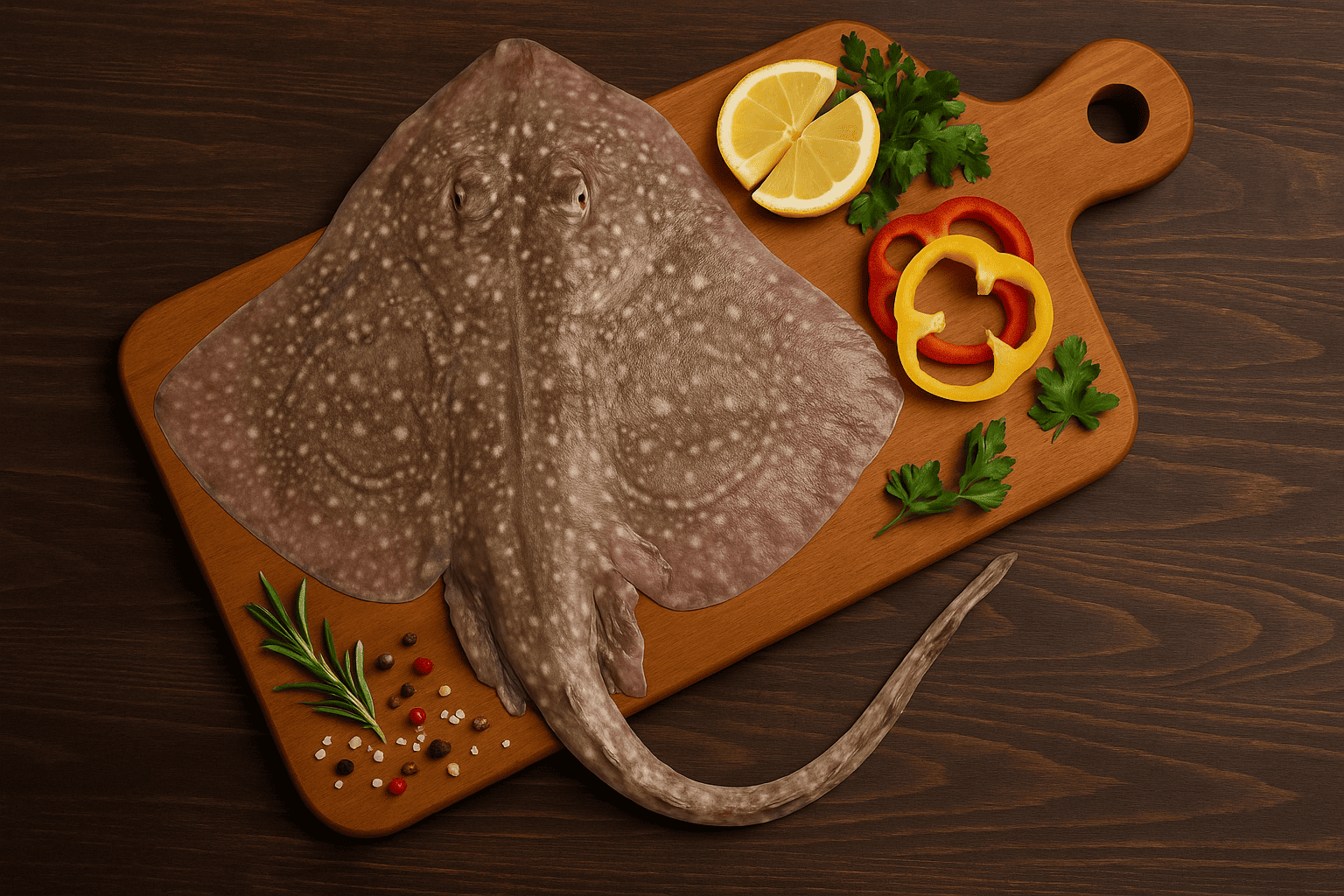 - اللون والجلد: السطح الظهري لونه بني مغطى بنمط غير منتظم من النقاط السوداء والبقع الفاتحة. كما توجد في كثير من الأحيان بقع سوداء كبيرة في منتصف الزعانف الصدرية. السطح الظهري أملس بشكل عام ولكنه قد يحتوي على أشواك صغيرة على الهوامش العلوية، بينما الذيل شائك ويحمل صفاً وسطياً من الأشواك.