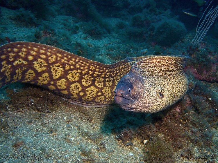 | الشكل والمظهر | الجسم: طويل وشبيه بالثعبان (anguilliform) وسميك، يمكن أن يصل طوله إلى 1.5 متر. الجلد: مغطى بمخاط سميك، بدون حراشف أو زعانف صدرية. اللون: عادة ما يكون بني غني أو رمادي غامق مع بقع كبيرة صفراء، كل منها يحتوي على بقع بنية أصغر. الرأس: كبير نسبياً، ذو فكين قويين وأسنان أنياب حادة وطويلة. |